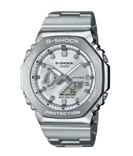 Introducing the GM2110D — an analog-digital combination G-STEEL based on the GA2100, now with a stylish metal bezel and band update. Meticulously forged and polished, the uniform octagonal stainless-steel bezel anchors a simple, no-fuss design with a sophisticated, yet tough look. Made of high-rigidity glass-fiber-reinforced fine resin, the case is the slimmest of all G-SHOCK combination models, at just 11.8 mm. The metal bracelet, together with a pop of fresh color from the metallic brass dial, is up for anything — work or play. Choose from, sky blue, orange, or lime green, in addition to classic hues of navy and silver. All with high-brightness double LED light, ensuring an easy read even in the dark.