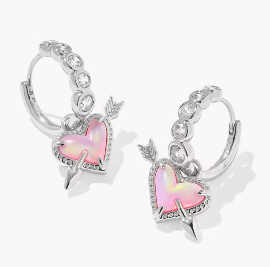 KENDRA SCOTT- Ari Rhodium Heart Arrow Huggie Earrings in Pink Opal Resin