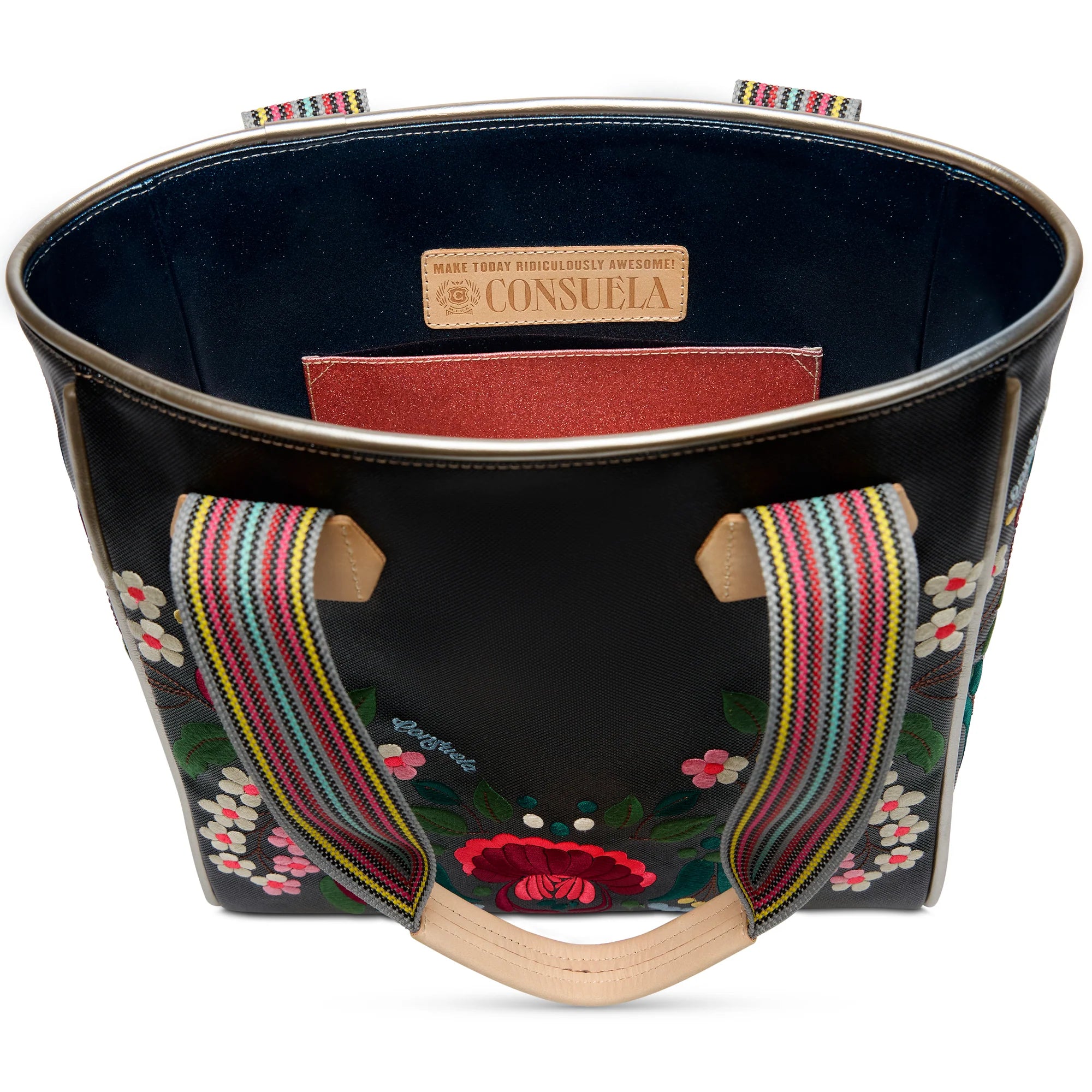 The Classic Tote has been our signature Consuela silhouette since the beginning. This bold embroidered tote bag holds its shape while carrying all of the essentials. You’re ready for anything that comes your way! Iconic floral embroidery on ebony woven exterior Interior slide pocket and zipper pocket Comfortable woven straps Trimmed in natural, untreated leather...